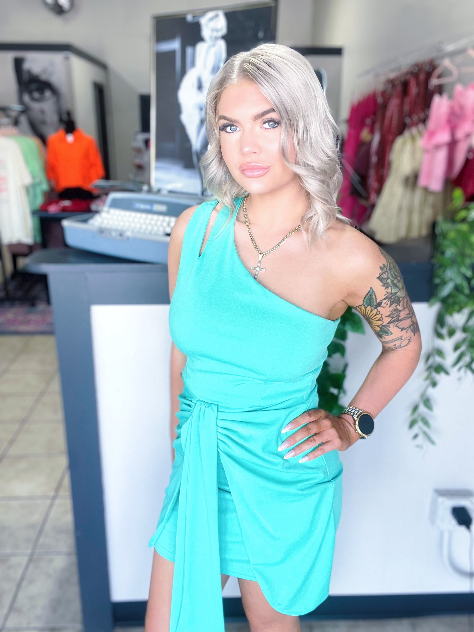 Crafted from a blend of polyester and spandex, this bodycon dress features a flattering silhouette with a unique one shoulder design and a chic front tie. Ideal for cocktail parties and elegant evenings.