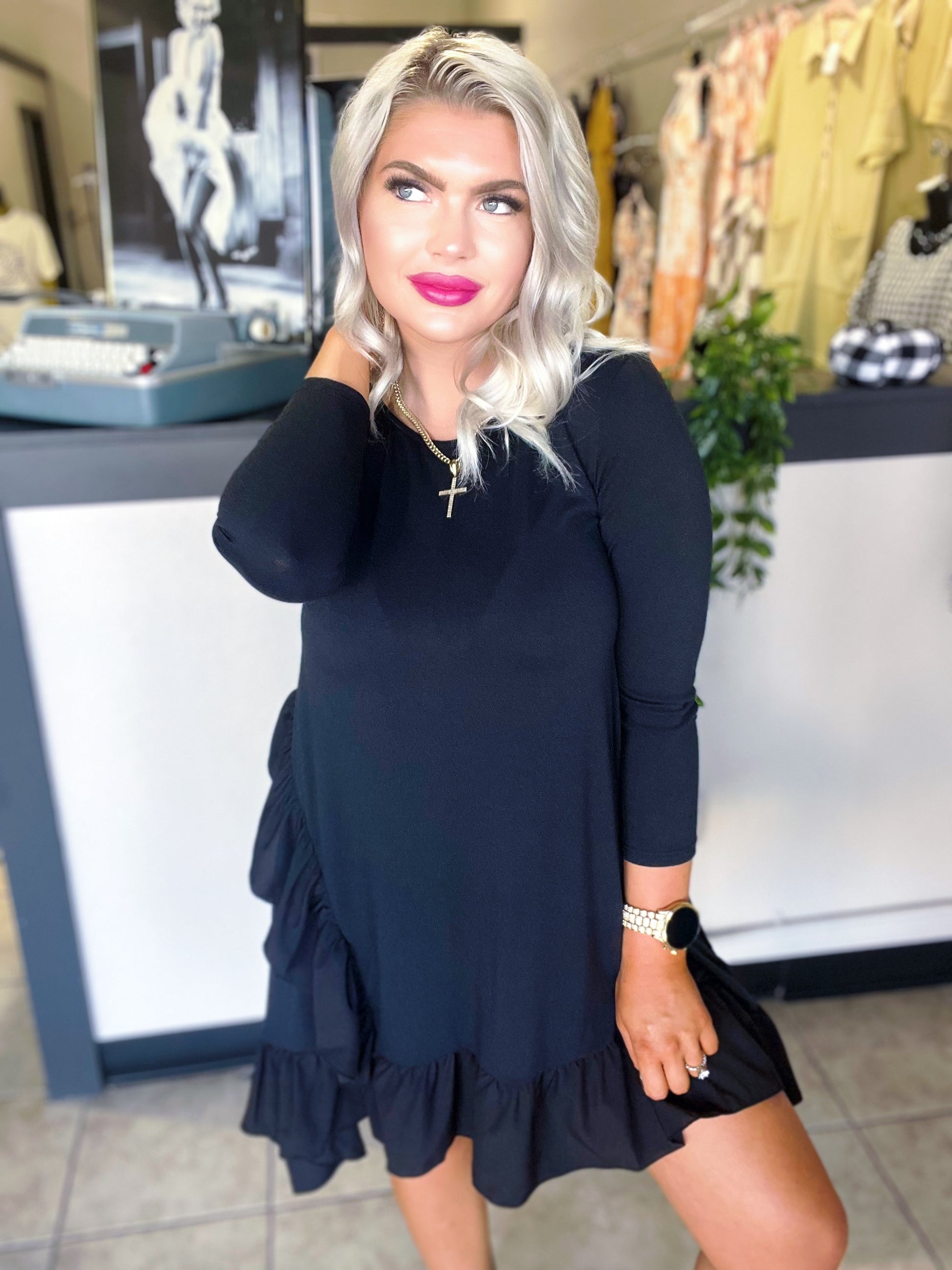 is high-low mini dress is a versatile and trendy option. The 3/4 sleeves, loose fit, and ruffle detailing create a feminine and playful silhouette, while the soft and comfortable fabric makes it a must-have for any season. This dress is perfect for both casual and dressy occasions.